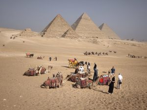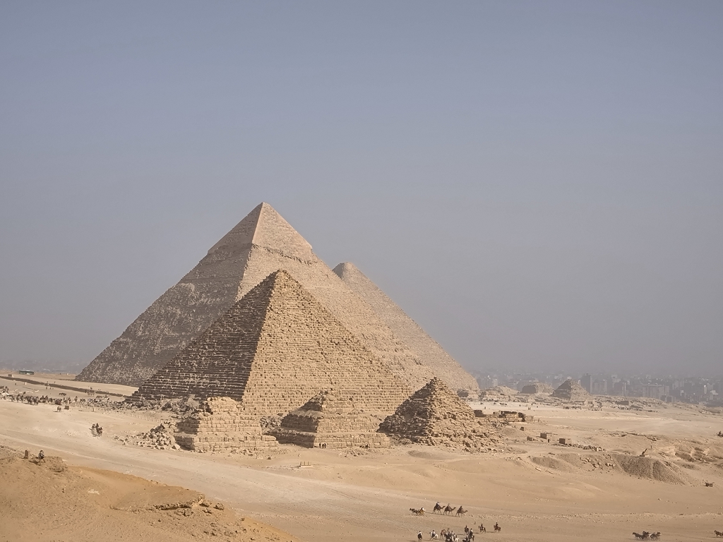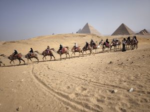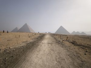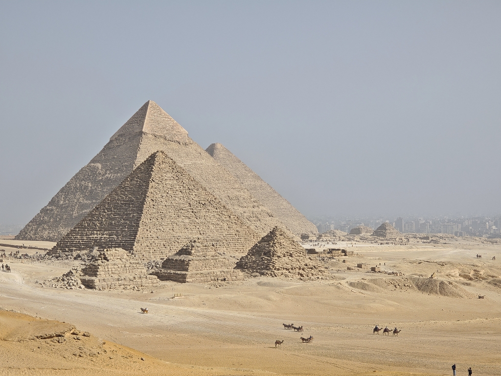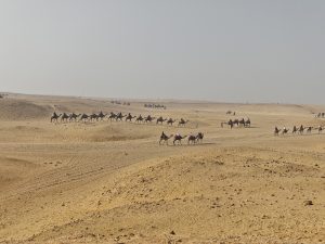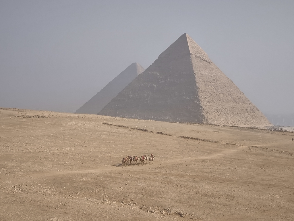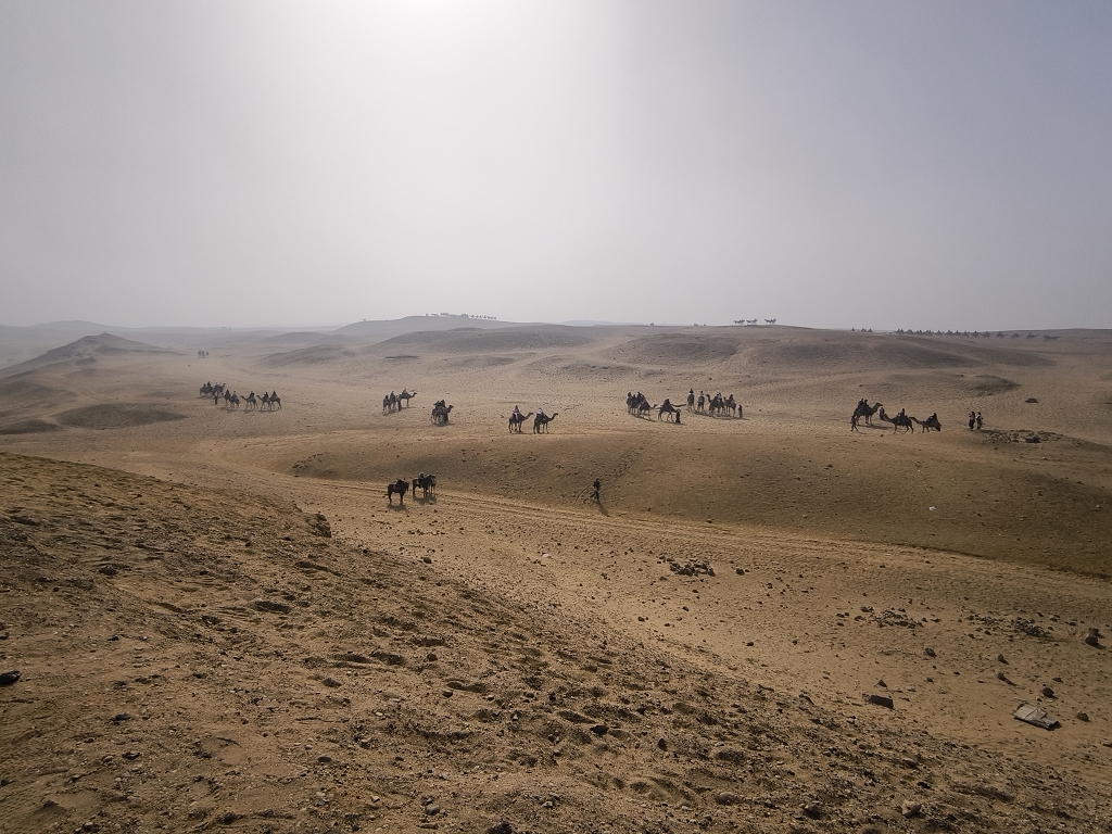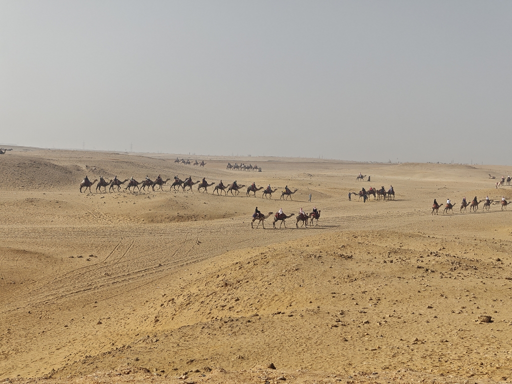 Von dort aus nahm auch die Dichte an Kamelen, Pferden und Kutschen deutlich zu, weil von hier aus ein gutes Stück gelaufen oder gefahren / getragen werden muss, um die verschiedenen Aussichtspunkte zu erreichen. Da das Wetter mit 20 Grad recht angenehm war, entschieden wir uns, uns auf eigen Faust ins Gelände aufzumachen und uns selbst die besten Punkte zu suchen, von denen man aus die 3 großen und 6 kleinen Pyramiden erspähen konnte. Wir hatten Glück, dass sich die Dunstglocke über Kairo ein klein wenig lichtete und wir so nach und nach immer bessere Bilder von den Pyramiden, den Kamelkarawanen und der endlosen Wüste bekamen. Die Szenerie erinnerte an die Fantasiegeschichten aus dem Morgenland mit Beduinen, die durch den endlosen Sand ziehen. Spannenderweise wurden wir, sobald wir uns zum Laufen entschlossen hatten, kaum noch angesprochen, ob wir denn ein Kamel oder ähnliches brauchen. So war es für uns eine wirklich beeindruckendes Erlebnis, dass wir wirklich in vollen Zügen genossen.