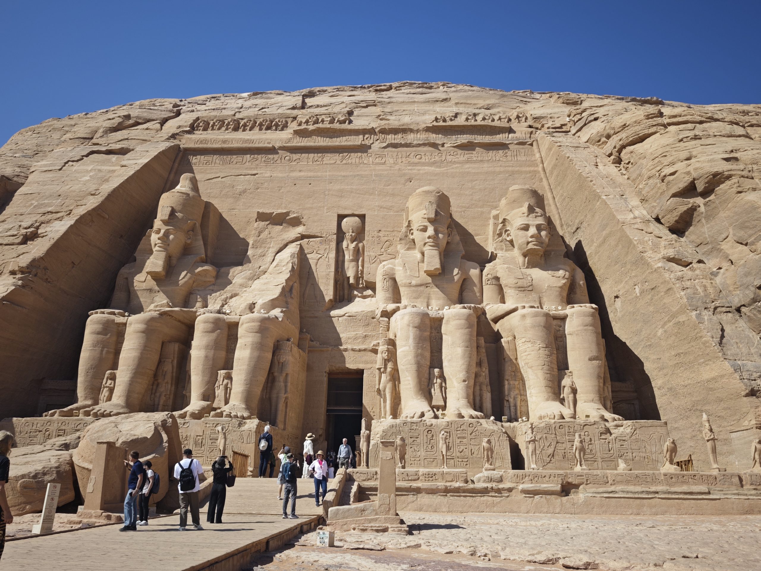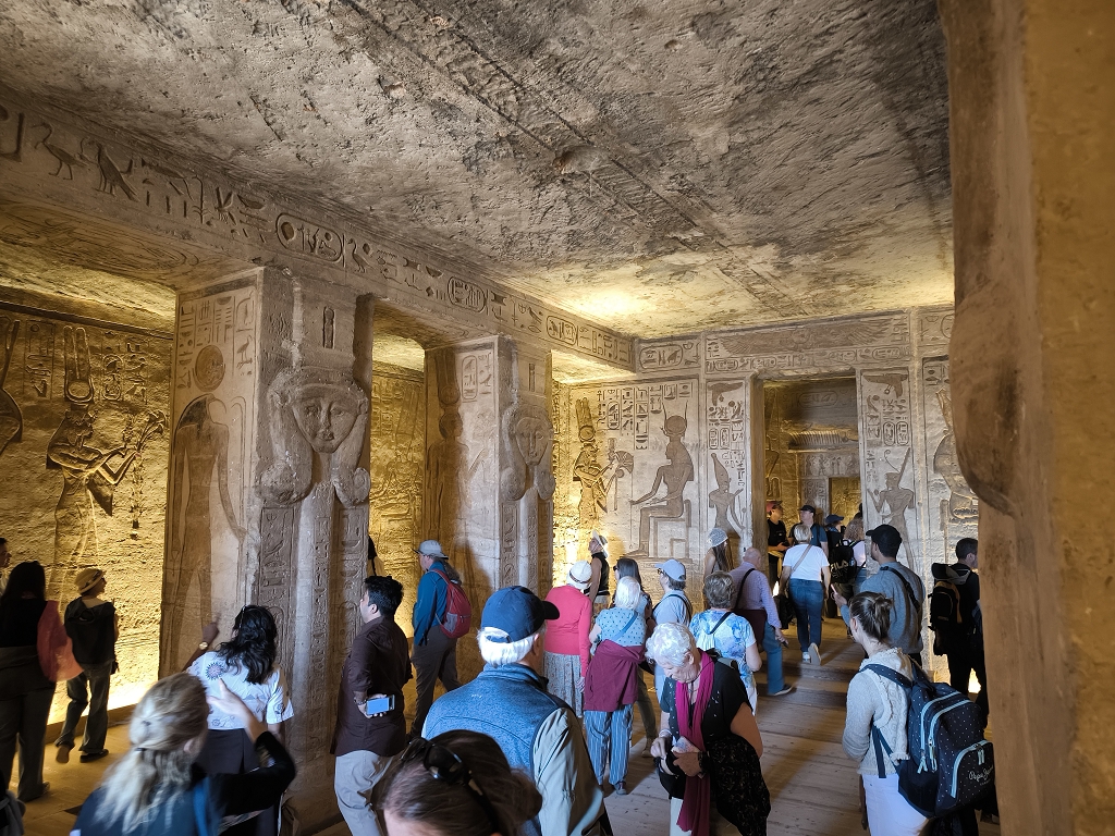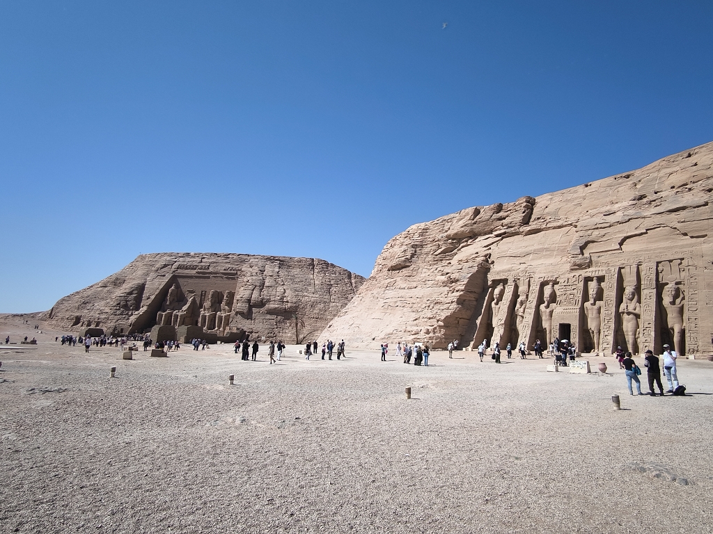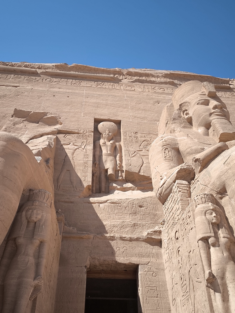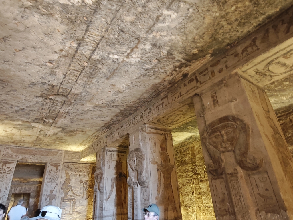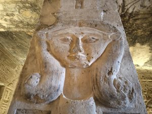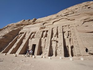 Da ist der zweite kleinere Tempel zu Ehren seiner Frau Nefertari und Hathor völlig gegensätzlich. Hier geht es viel mehr um Fruchtbarkeit und Leben. Besonders zu erwähnen ist, dass bei den Statuen vor dem Tempel er und sie gleich groß sind. Das ist normalerweise nicht üblich, der Pharao ist immer wichtiger als die Frau. Das deuten die Gelehrten so, dass er seine Frau wirklich als ebenbürtige Partnerin gesehen hat.