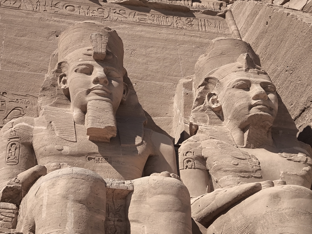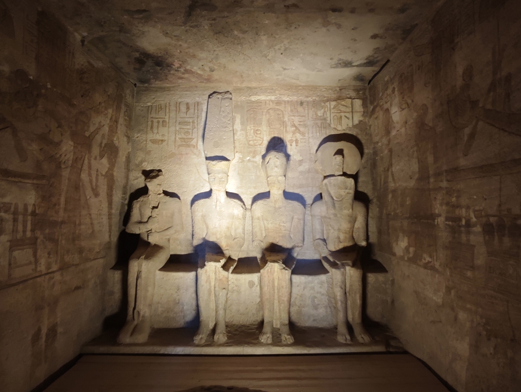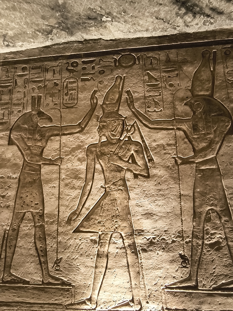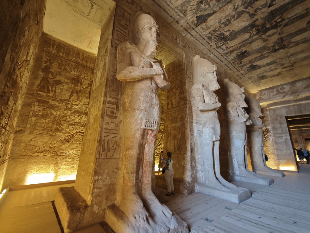 Wenn wir von den Tempeln in Abu Simbel sprechen, fallen einem immer die 4 riesigen Statuen von Ramses II. am Eingang ein und natürlich die Verlegung der Tempel in den 60er Jahren, um sie vor den Fluten des Stausees zu schützen. Beides ist wirklich faszinierend, aber der Tempel hat auch im Innern sehr viele tolle Statuen und Reliefs zu bieten. Besonders interessant ist, wie kriegerisch die Szenen in diesem Tempel sind. Jede Wand zeigt Bilder, wie Ramses II. seine Feinde in den Staub zwingt und er mit seinem großen Streitwagen alle Gegner besiegt – sehr martialisch. Auch die Mengen an Statuen von ihm lassen doch einen gewissen Komplex erkennen.