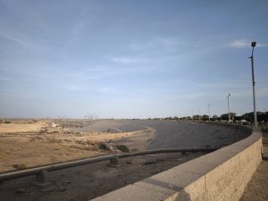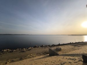 Hatte ich Helfersyndrom schon erwähnt – schon, oder? Natürlich fand unser Fahrer noch jemand auf dem Damm, der mit seinem Auto liegen geblieben war und leistete erste Hilfe. Zwar war da wenig Chance. alle platten Reifen wieder hinzukriegen und außerdem werkelte da schon die Polizei, das Militär und und und mit aber ohne unseren Fahrer ging da gar nix 😉 Natürlich alles ein bisschen unter Zeitdruck, weil der Damm ab 17 Uhr geschlossen wird und es schon 10 nach 5 war. Egal – das Militär schleuste uns durch den letzten Spalt raus und endlich gegen halb 6 neigte sich der Tag dem Ende entgegen.