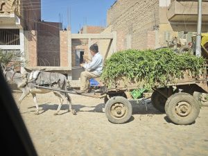 Ansonsten kommt man recht flott bis kurz vor Abydos. Dort muss man die Autobahn verlassen und danach wird es abenteuerlich. Für die letzten 15KM bis zum Tempel braucht man über eine halbe Stunde, weil keine geteerte Straße zu diesem bedeutenden Tempel führt. Über eine unsägliche Schlaglochpiste, durch Dörfer in denen das Leben tobt und Felder, wo sich die Eselkarren ballen schlängelt man sich seinen Weg nach Abydos. Wir konnten so einen wunderbaren Einblick in den Mikrokosmos des ägyptischen Dorflebens genießen