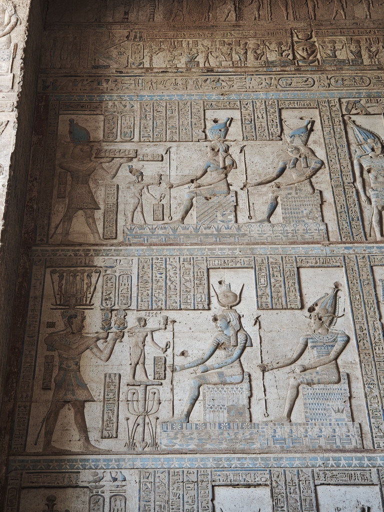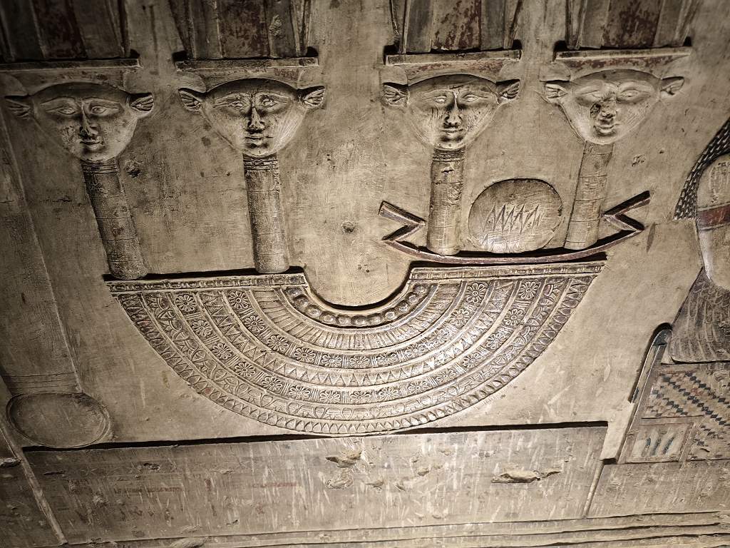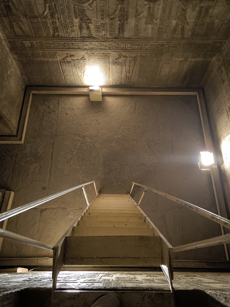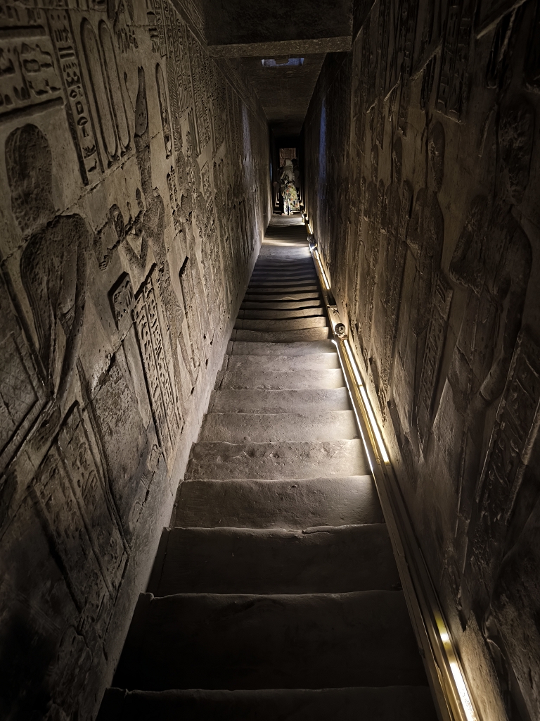 Das spannende bei diesem Tempel war auch, dass man hier auf verschiedenen Ebenen, den Tempel entdecken konnte. So gab es einen Prozessionsweg aufs Dach auf dem Würdenträger einen links und rechts nach oben begleiteten. Dort fand man dann einzigartige Darstellungen von Einbalsamierungen und Totenritualen. Aber nicht nur hoch hinaus, sondern auch in die Krypta durfte man hinabsteigen – durch ein winziges Loch erreichte man einen Gang mit vielen sehr beeindruckenden Reliefs