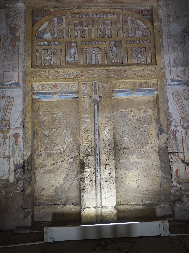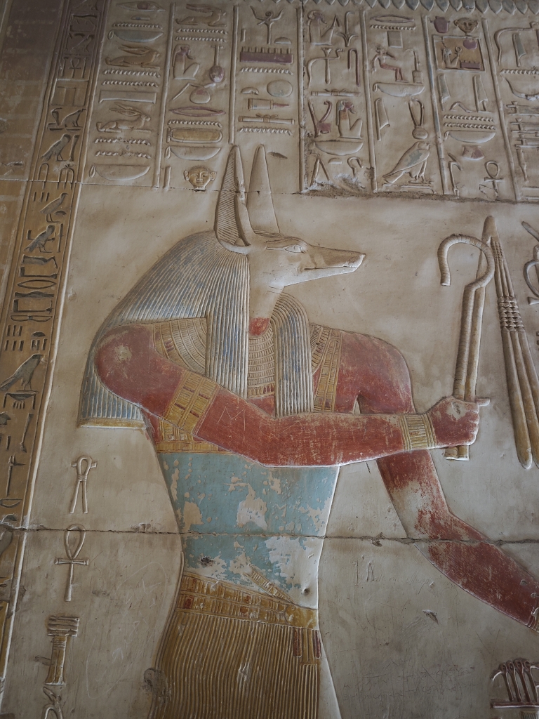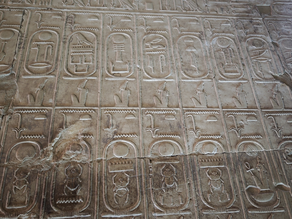 Zurück zum Tempel. Es war richtig angenehm, in Ruhe durch die Säulenhallen zu wandeln und viele neue unbekannte Szenen zu entdecken. Da der Tempel komplett mit Dach kommt und deshalb auch weniger beleuchtet ist, hinterlässt er einen viel mystischeren Eindruck und man fühlt sich in wie damals gewünscht am Eingang ins Totenreich. Uns haben vor allem die feinen Reliefs begeistert , die auch an vielen Stellen noch komplett farbig waren. Außerdem ist Abydos auch berühmt für die Königsliste. Für Ägyptologen ein Glücksfall – so wussten sie endlich ganz genau welche Pharaonen es in welcher Reihenfolge bisher gegeben hatte 😉