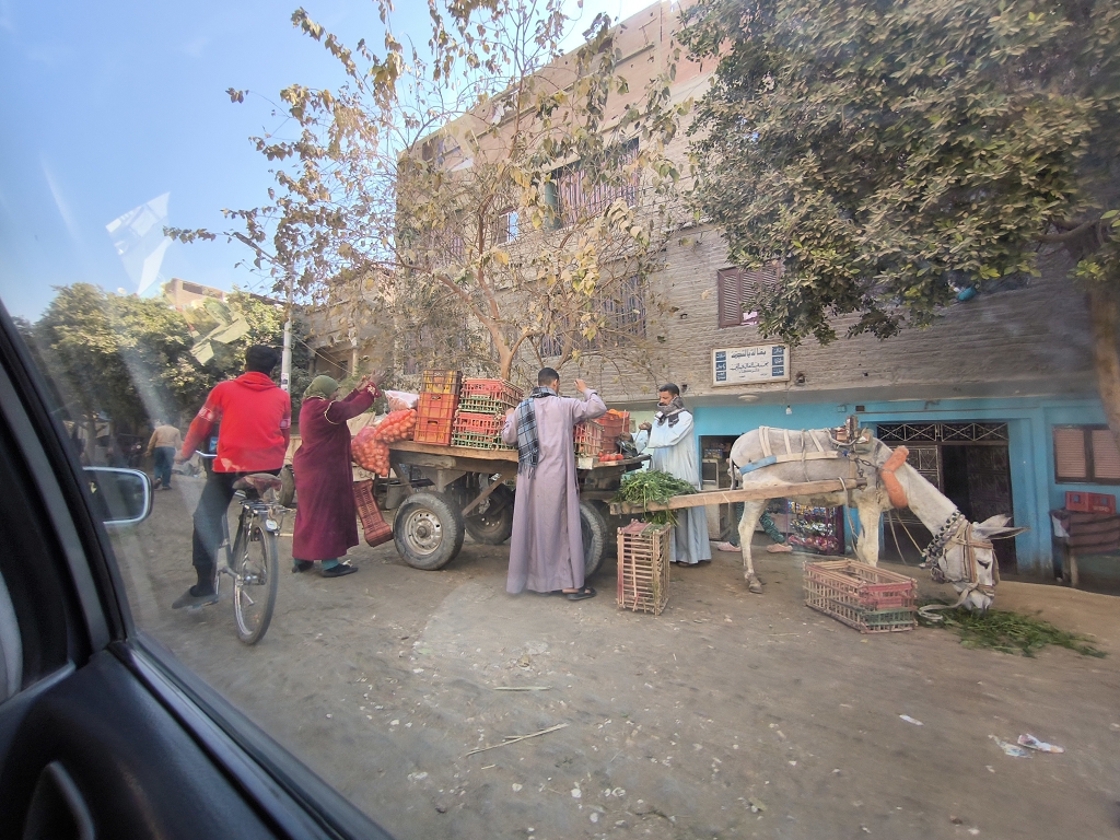 Ansonsten kommt man recht flott bis kurz vor Abydos. Dort muss man die Autobahn verlassen und danach wird es abenteuerlich. Für die letzten 15KM bis zum Tempel braucht man über eine halbe Stunde, weil keine geteerte Straße zu diesem bedeutenden Tempel führt. Über eine unsägliche Schlaglochpiste, durch Dörfer in denen das Leben tobt und Felder, wo sich die Eselkarren ballen schlängelt man sich seinen Weg nach Abydos. Wir konnten so einen wunderbaren Einblick in den Mikrokosmos des ägyptischen Dorflebens genießen