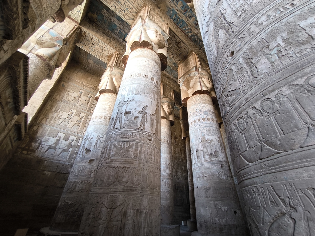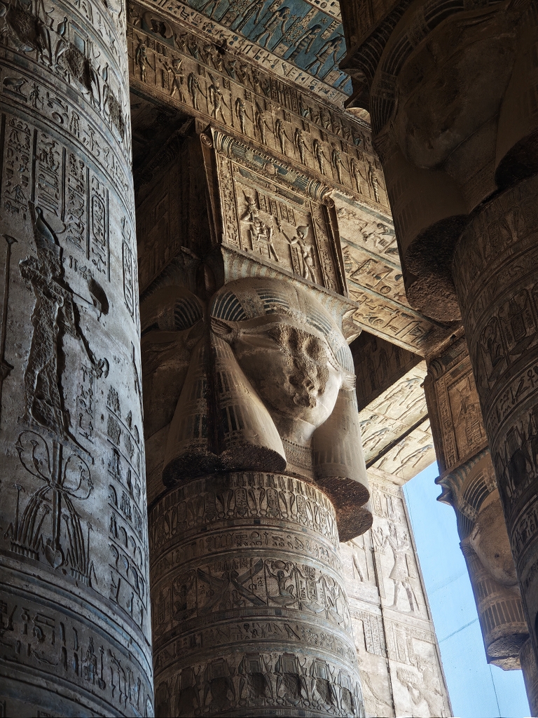 Dendera wurde sofort zu unserem Lieblingstempel, weil er so ungewöhnlich ist. Der Tempel ist für ägyptische Verhältnisse sehr jung – gerade mal 2500 Jahre aus der 30. Dynastie, aber das tut der Einzigartigkeit des Ensembles kein Abbruch. Hier gab es so viele Sachen zu entdecken, dass wir uns 2h durch jeden Winkel gearbeitet haben.
