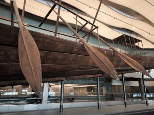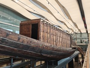 So gestärkt gingen wir in das Nebengebäude, wo in einer riesigen Halle ein weiteres Highlight auf uns wartete. 1950 wurde bei Ausgrabungen vor der Cheops Pyramide ein fast vollständig erhaltenes Boot als Grabbeigabe entdeckt. Bis vor wenigen Jahren wurde das Boot direkt vor Ort an der Pyramide ausgestellt, bis es 2018 hierher in das neue Museum umgezogen wurde.