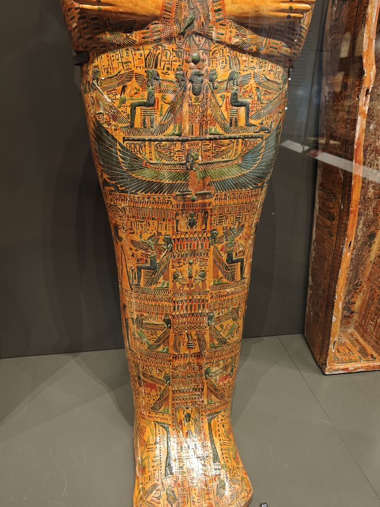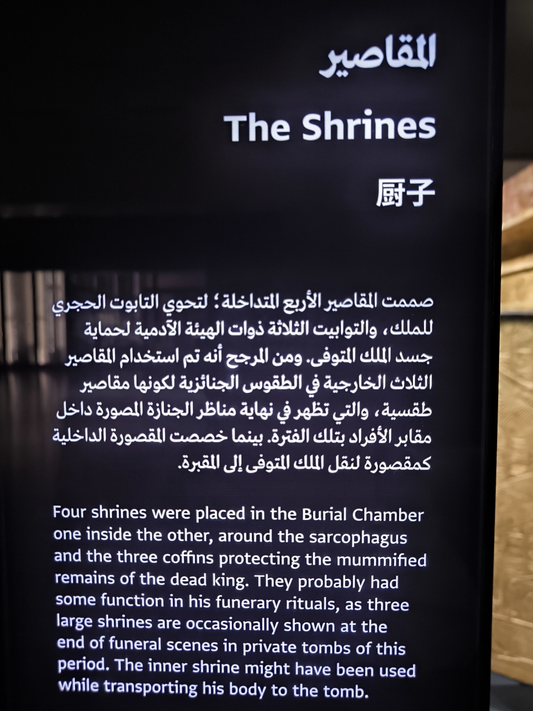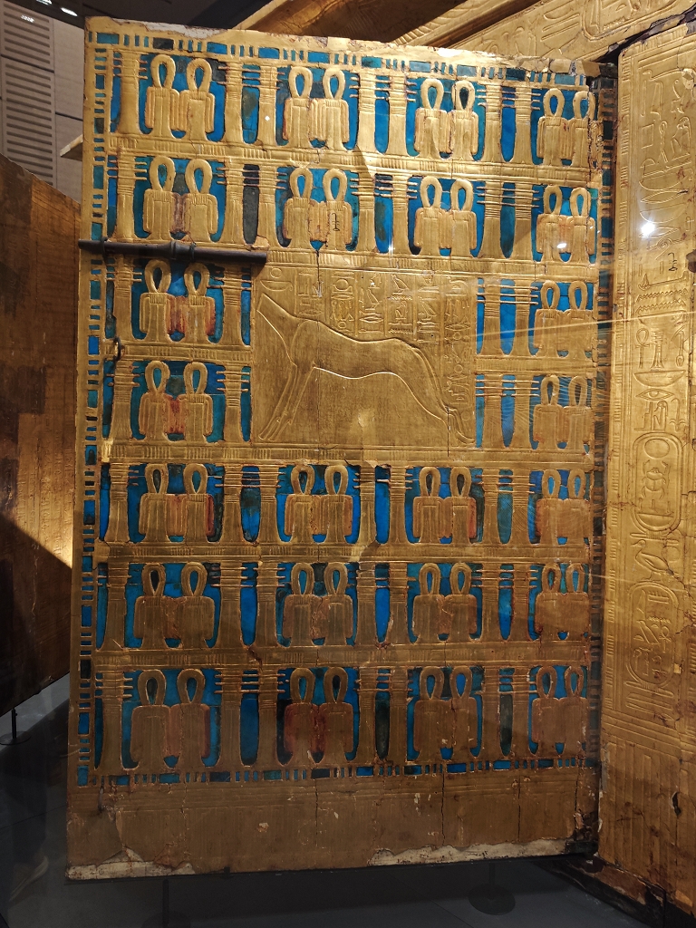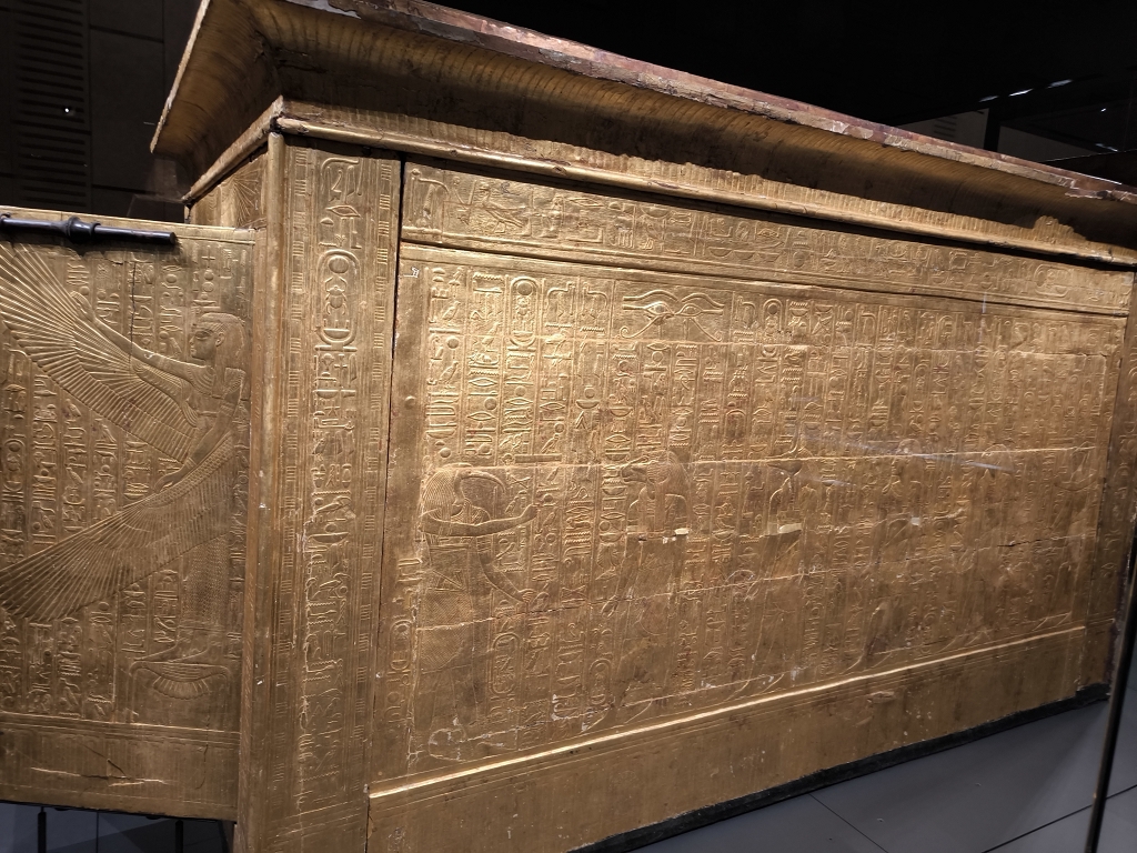 Da werden die über 60 Statuen auf der großen Treppe links liegen gelassen und der Ramses II in der Eingangshalle nur mit einem Augenaufschlag bedacht. Alles drängt und stürmt zu der Maske ;-). Und ja, die Maske ist wirklich einzigartig, aber die ganze Pracht der Grabbeigaben übersteigt jede Vorstellung. Besonders beindruckend ist, wie die Mumie an sich geschützt war. Klassisch war die Mumie in 3 ineinander gelegten Sarkophage eingepackt. Darum wurden 4 vergoldete Schreine auch wieder ineinander geschachtelt, wie bei einer russischen Matroschka. Jeder Schrein war natürlich noch einer anderen Schutzgöttin geweiht, und so geschützt wartete der Pharao auf das Leben nach dem Tod.
