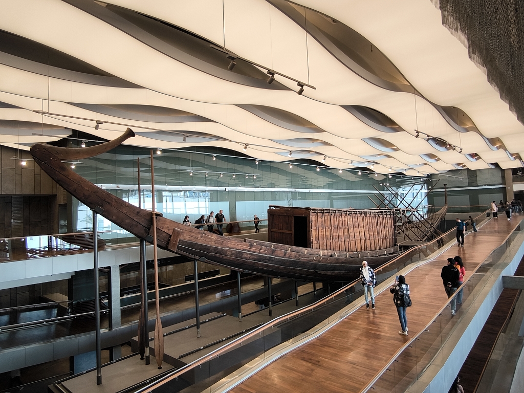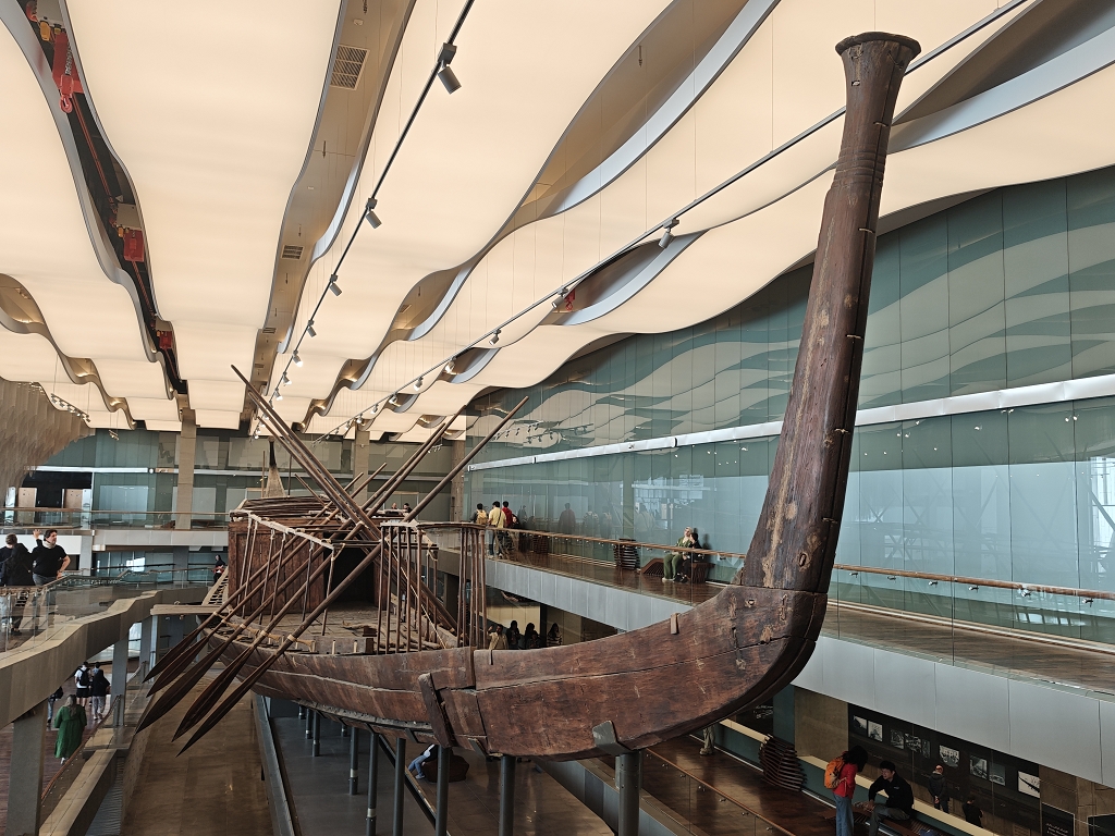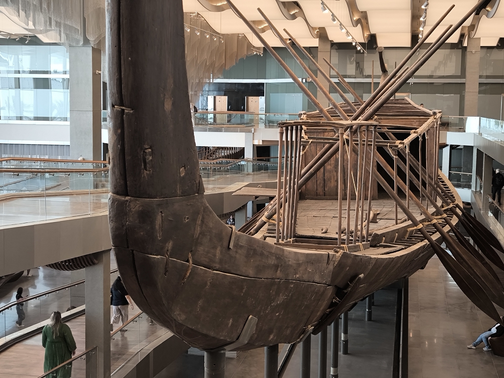 So gestärkt gingen wir in das Nebengebäude, wo in einer riesigen Halle ein weiteres Highlight auf uns wartete. 1950 wurde bei Ausgrabungen vor der Cheops Pyramide ein fast vollständig erhaltenes Boot als Grabbeigabe entdeckt. Bis vor wenigen Jahren wurde das Boot direkt vor Ort an der Pyramide ausgestellt, bis es 2018 hierher in das neue Museum umgezogen wurde.