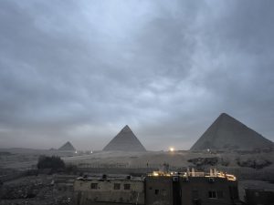 Trotz des schlechten Wetters führte unser erster Weg im Hotel auf die Dachterrasse – und da standen die 3 großen Pyramiden zum Greifen nah – Wahnsinn! Eine wirklich magische Stimmung. Wir freuen uns schon darauf, sie morgen noch ein bisschen näher kennen zu lernen.