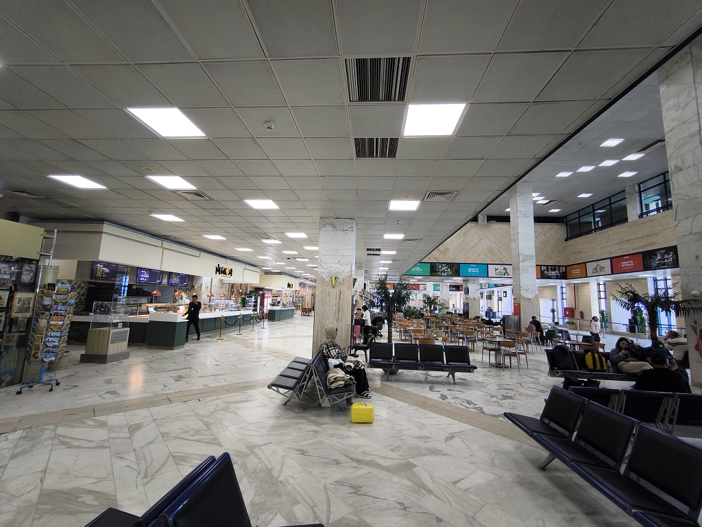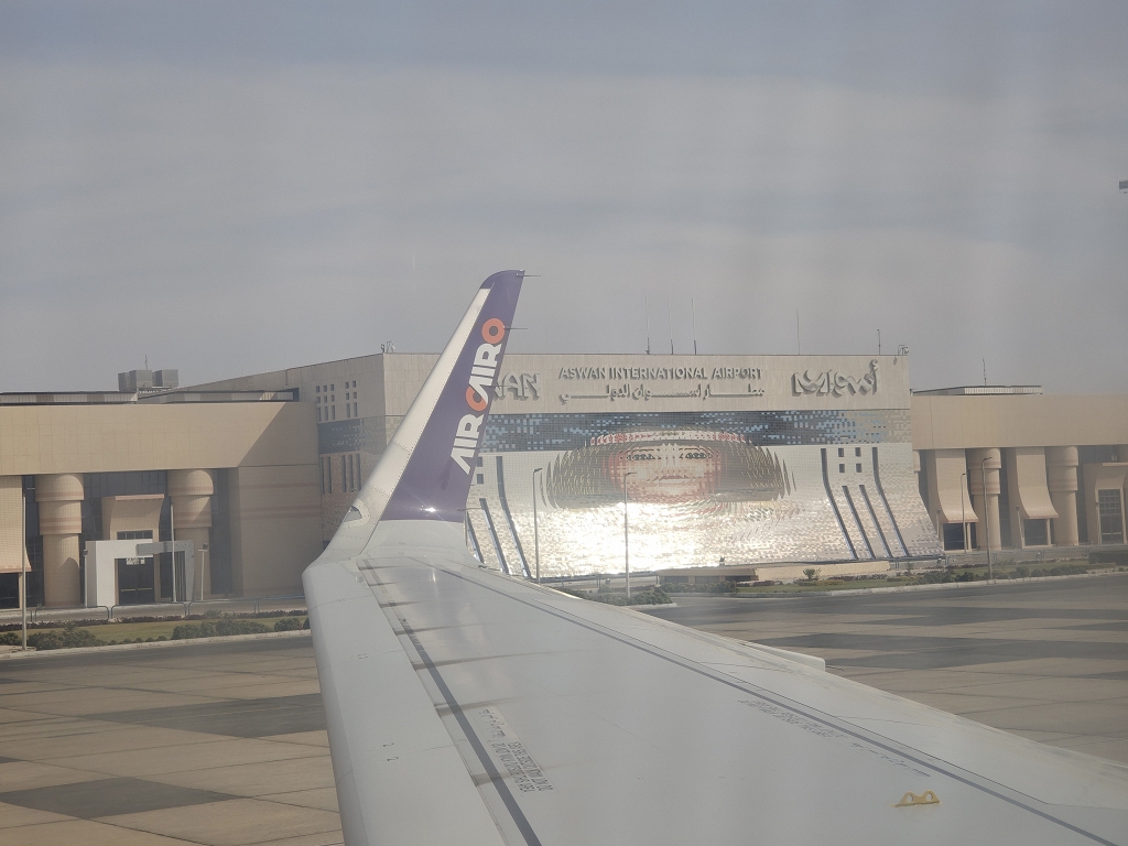 Wie toll es klingt, wenn man sich Internationaler Flughafen nennen kann – lustigerweise gibt es aber von hier nur 2 Verbindungen: ein paar Mal am Tag nach Kairo und ab und an nach Abu Simbel. Aus diesem Grund geht es hier auch sehr beschaulich zu, Die Handvoll Touristen verteilen sich bequem in der großzügigen Halle und die Preise sind auch nicht so wahnsinnig überteuert. Natürlich hatte unser Flieger Verspätung und so saßen wir recht entspannt und gemütlich bei Tee und Snacks, bis sich unser Flieger bequemte, aus Kairo einzuschweben.
