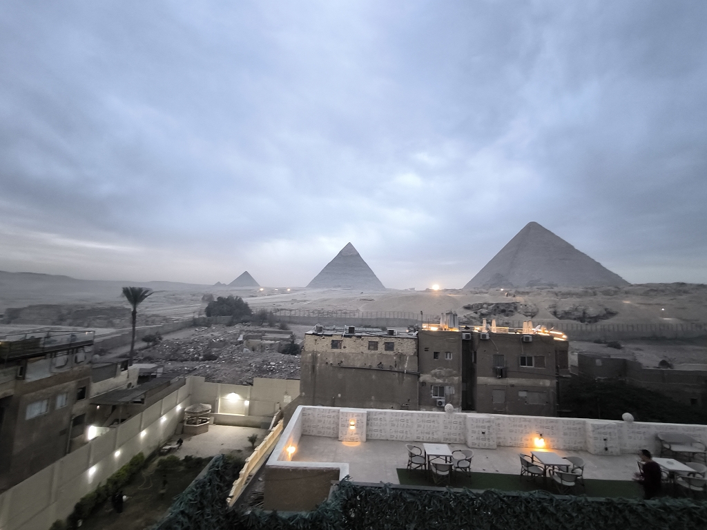 Trotz des schlechten Wetters führte unser erster Weg im Hotel auf die Dachterrasse – und da standen die 3 großen Pyramiden zum Greifen nah – Wahnsinn! Eine wirklich magische Stimmung. Wir freuen uns schon darauf, sie morgen noch ein bisschen näher kennen zu lernen.