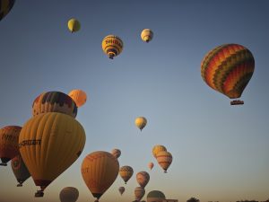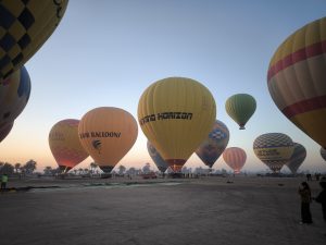 Dann wird es hektisch. Ein Mini Luftballon wird fliegen gelassen und alle schauen gebannt, ob er in die falsche Richtung treibt – das ist High-Tech vom Feinsten. Aber keine Angst, das Ganze ist wirklich sicher, die Leute wissen schon was sie tun – das Ganze wirkt zwar chaotisch – aber die Piloten sind offiziell lizensiert und das Ganze wird von der zivilen Luftfahrtbehörde überwacht. Nachdem der Ballontest positiv war, wurde es schon wieder hektisch und auf dem gesamten Platz wurden die erste Runde von Ballons aufgeblasen und die ersten Passagiere machten es sich im Korb gemütlich – hier sprechen wir nicht von Körbchen sondern riesigen Körben, in den 24 Leute Platz haben. Wenn die erste Runde Ballons in der Luft sind kommt auch schon der nächste LKW mit dem nächsten Korb und weiter geht es, und so werden nach und nach jeden Morgen in kurzem Abstand über 50 Ballons in die Luft gebracht.