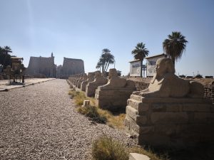 Von Karnak zum Luxortempel führt eine 2,5km lange Prachtstraße, die im Altertum links und rechts von Sphinxen geschmückt war. Laut diesem Internet gab es in den letzten Jahren große Anstrengungen, diese Prachtstraße wieder herzurichten und es sei eine beeindruckende Wanderung, um von K nach L zu kommen. Leider ist das aber nicht so. Zwar ist die Prachtstraße heute komplett freigelegt und kreuzungsfrei begehbar. Nur leider besteht sie aus Staub, Dreck, Abfall und kaputten Steinen und sehr sehr wenigen Sphinxen – von unser Seite bleibt zu sagen – eher Nein! Vor allem ist es selbst bei 20 Grad immer noch eine schweißtreibende Angelegenheit, weil Schatten hier nicht vorkommt.