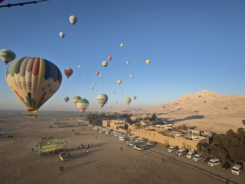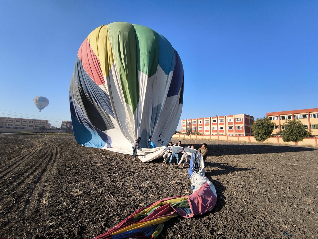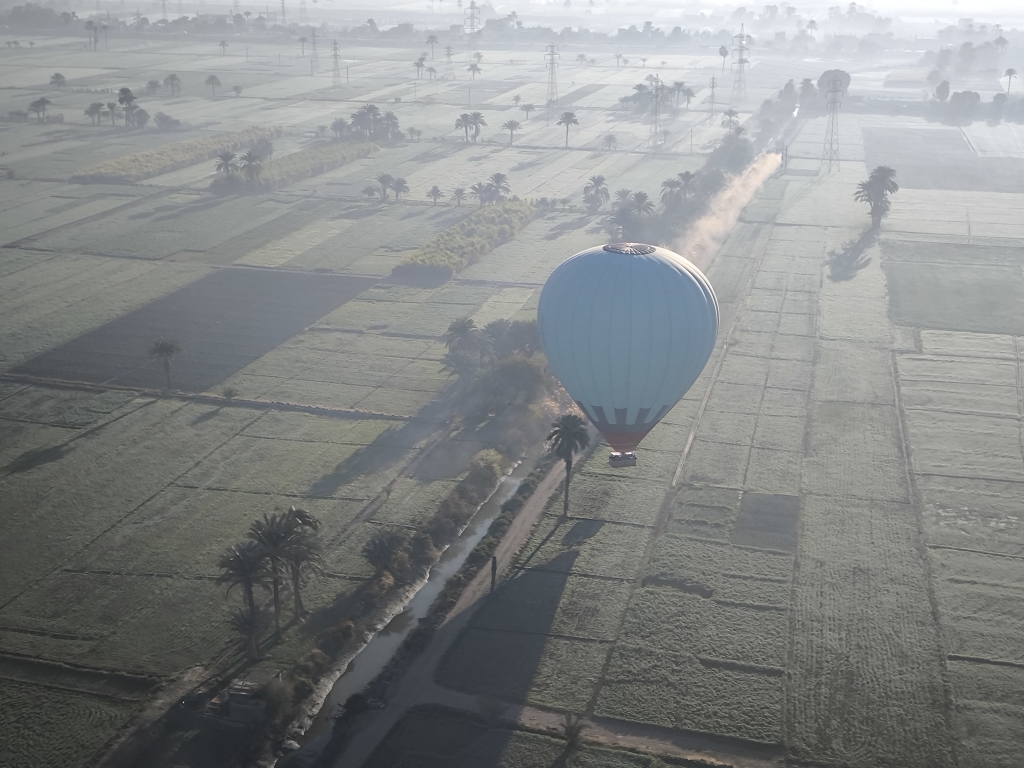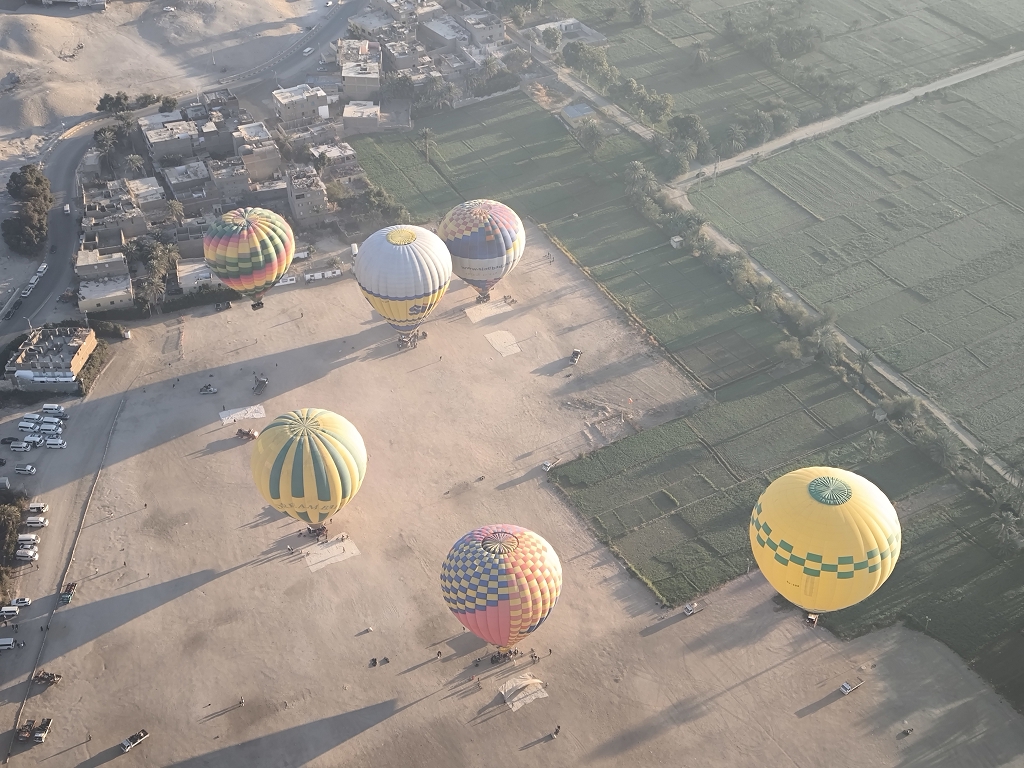Wir waren in Runde 2 dabei – deutlich nach Sonnenaufgang, aber nur 2 Stunden nach unserer Abholzeit. Mit einer bunten Mischung aus Asien und Europa ging es mit unserem Piloten in die Höhe. Und jetzt wurde es ein wirklich einmaliges Erlebnis – fast eine Stunde schwebten wir über den Tälern und Tempeln westlich des Nils. Unser Pilot machte einen sehr routinierten Eindruck und wir konnten das Erlebnis in vollen Zügen genießen. Aus der Vogelperspektive konnte man die ganzen Tempel noch besser erkennen und die Größe dieser bedeutenden Anlagen noch besser erfassen. Auch der Blick über die Zuckerrohrfelder war beeindruckend. Einen geeigneten Landeplatz zwischen den Stromleitungen zu finden dauerte etwas, und so kamen wir noch länger in den Genuss des Fliegens. Insgesamt ein wirklich eindrückliches Erlebnis.