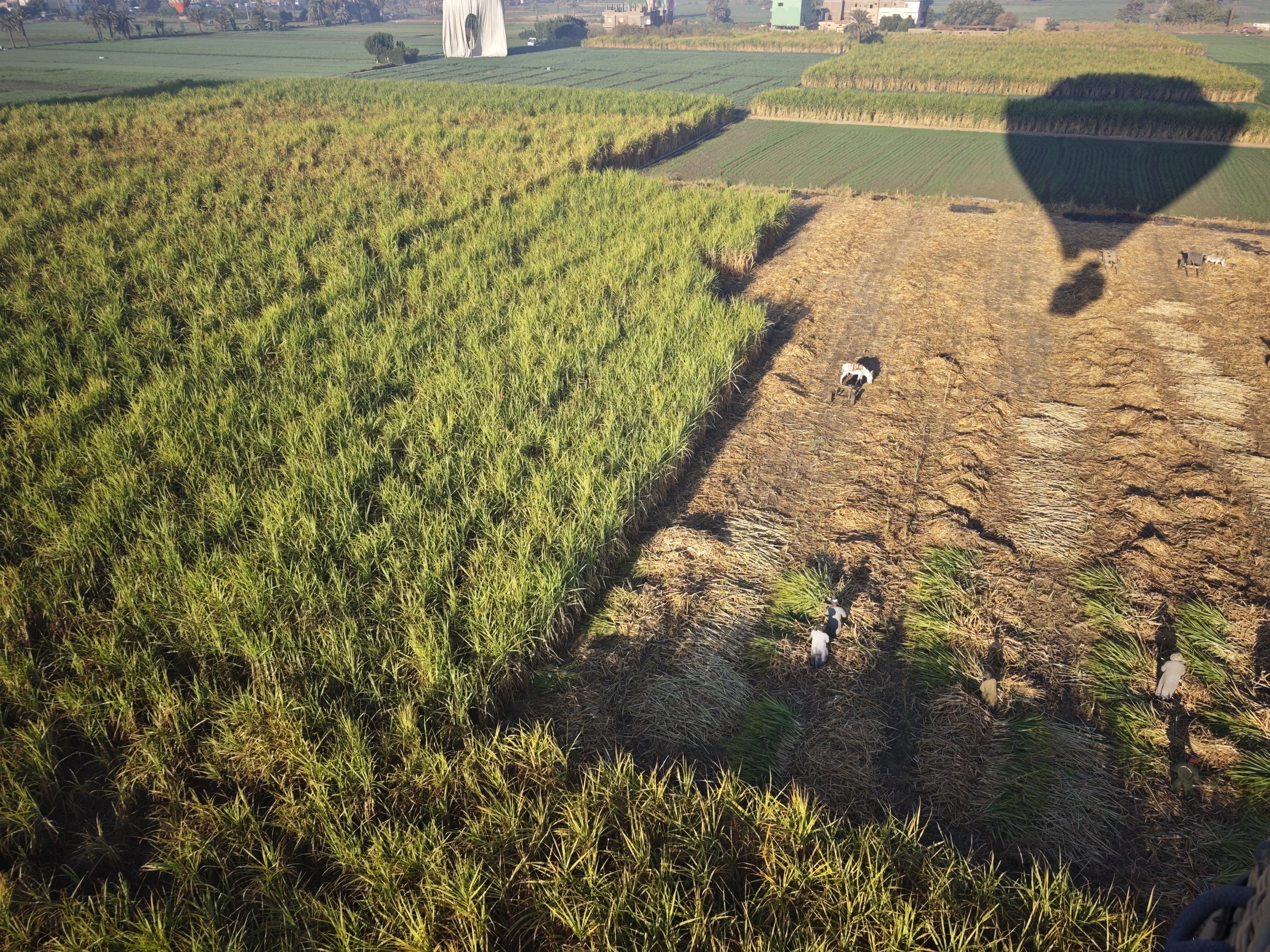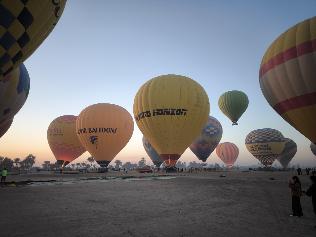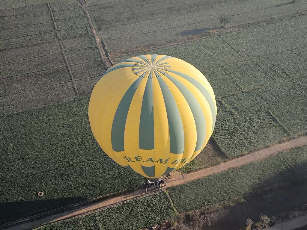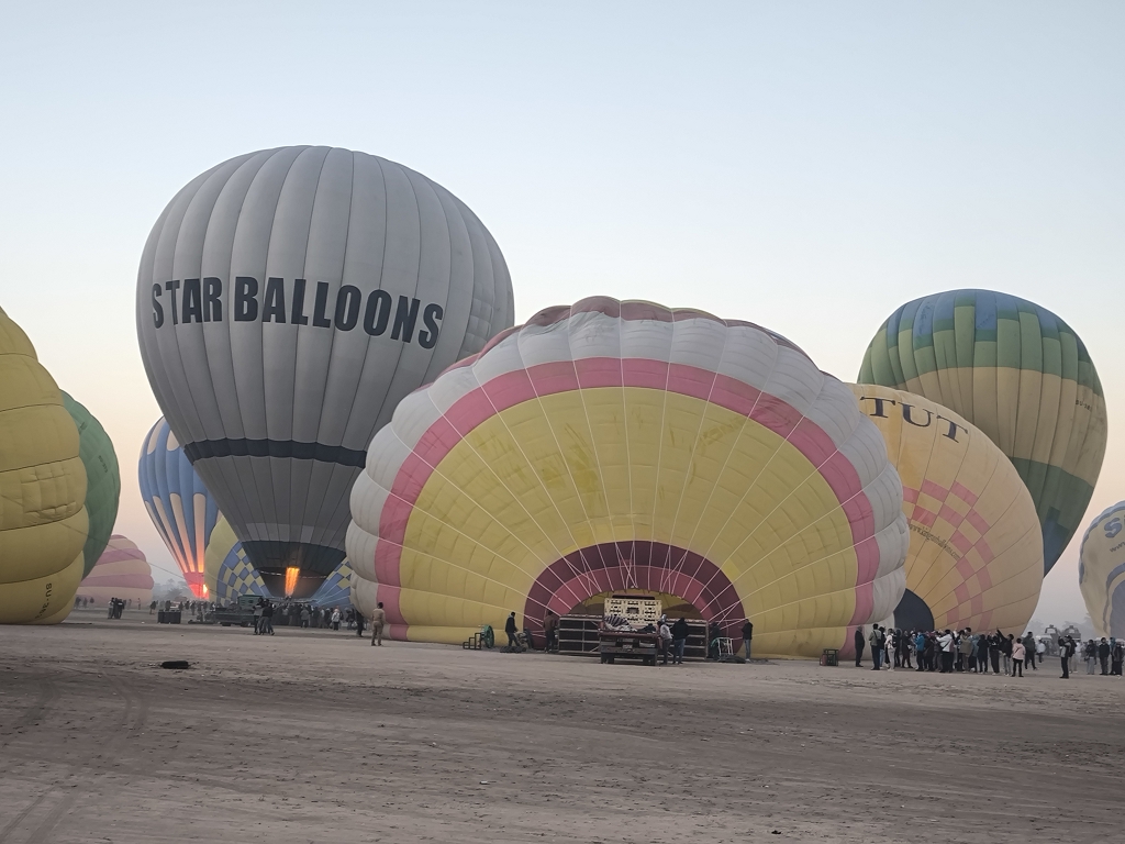 Wir waren in Runde 2 dabei – deutlich nach Sonnenaufgang, aber nur 2 Stunden nach unserer Abholzeit. Mit einer bunten Mischung aus Asien und Europa ging es mit unserem Piloten in die Höhe. Und jetzt wurde es ein wirklich einmaliges Erlebnis – fast eine Stunde schwebten wir über den Tälern und Tempeln westlich des Nils. Unser Pilot machte einen sehr routinierten Eindruck und wir konnten das Erlebnis in vollen Zügen genießen. Aus der Vogelperspektive konnte man die ganzen Tempel noch besser erkennen und die Größe dieser bedeutenden Anlagen noch besser erfassen. Auch der Blick über die Zuckerrohrfelder war beeindruckend. Einen geeigneten Landeplatz zwischen den Stromleitungen zu finden dauerte etwas, und so kamen wir noch länger in den Genuss des Fliegens. Insgesamt ein wirklich eindrückliches Erlebnis.