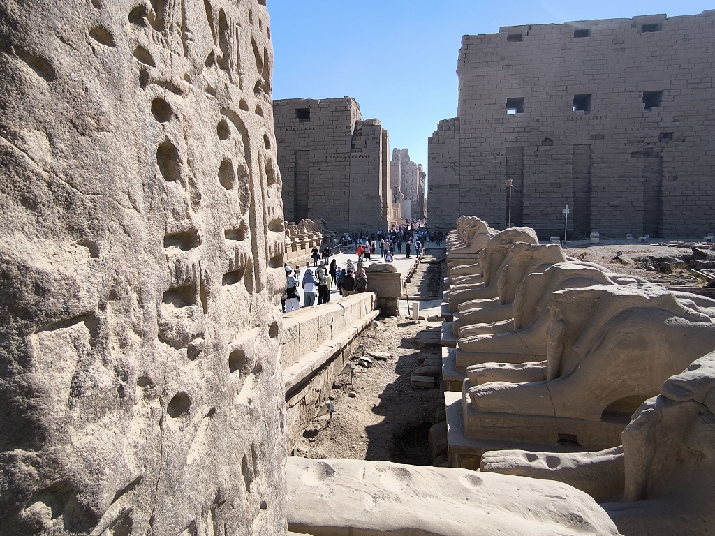 Von Karnak zum Luxortempel führt eine 2,5km lange Prachtstraße, die im Altertum links und rechts von Sphinxen geschmückt war. Laut diesem Internet gab es in den letzten Jahren große Anstrengungen, diese Prachtstraße wieder herzurichten und es sei eine beeindruckende Wanderung, um von K nach L zu kommen. Leider ist das aber nicht so. Zwar ist die Prachtstraße heute komplett freigelegt und kreuzungsfrei begehbar. Nur leider besteht sie aus Staub, Dreck, Abfall und kaputten Steinen und sehr sehr wenigen Sphinxen – von unser Seite bleibt zu sagen – eher Nein! Vor allem ist es selbst bei 20 Grad immer noch eine schweißtreibende Angelegenheit, weil Schatten hier nicht vorkommt.
